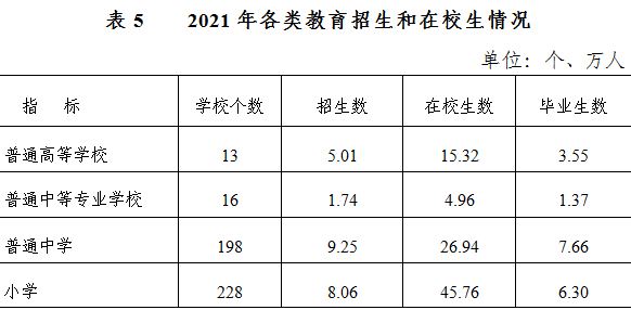 全市共有普通高校13所。普通高等教育本专科招生4.63万人,在校生14.23万人,毕业生3.32万人;研究生教育招生0.38万人,在校生1.09万人,毕业生0.23万人。全市中等职业教育在校生达7.47万人(含技校)。九年义务教育巩固率100%,高中阶段教育毛入学率100%,普及高中阶段教育。特殊教育招生296人,在校生1453人。全市共有幼儿园580所,比上年增加44所;在园幼儿21.37万人,比上年增加0.55万人。