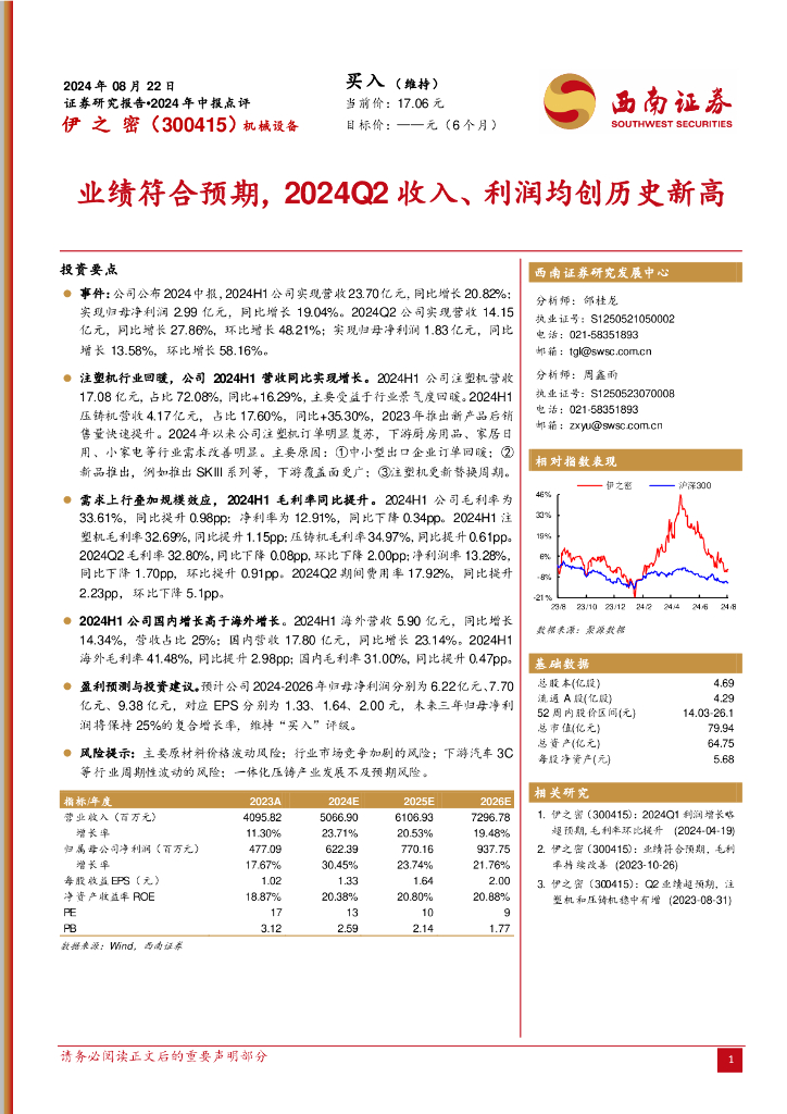 西南证券:伊之密(300415)-2024年中报点评:业绩符合预期,2024Q2收入、利润均创历史新高.pdf