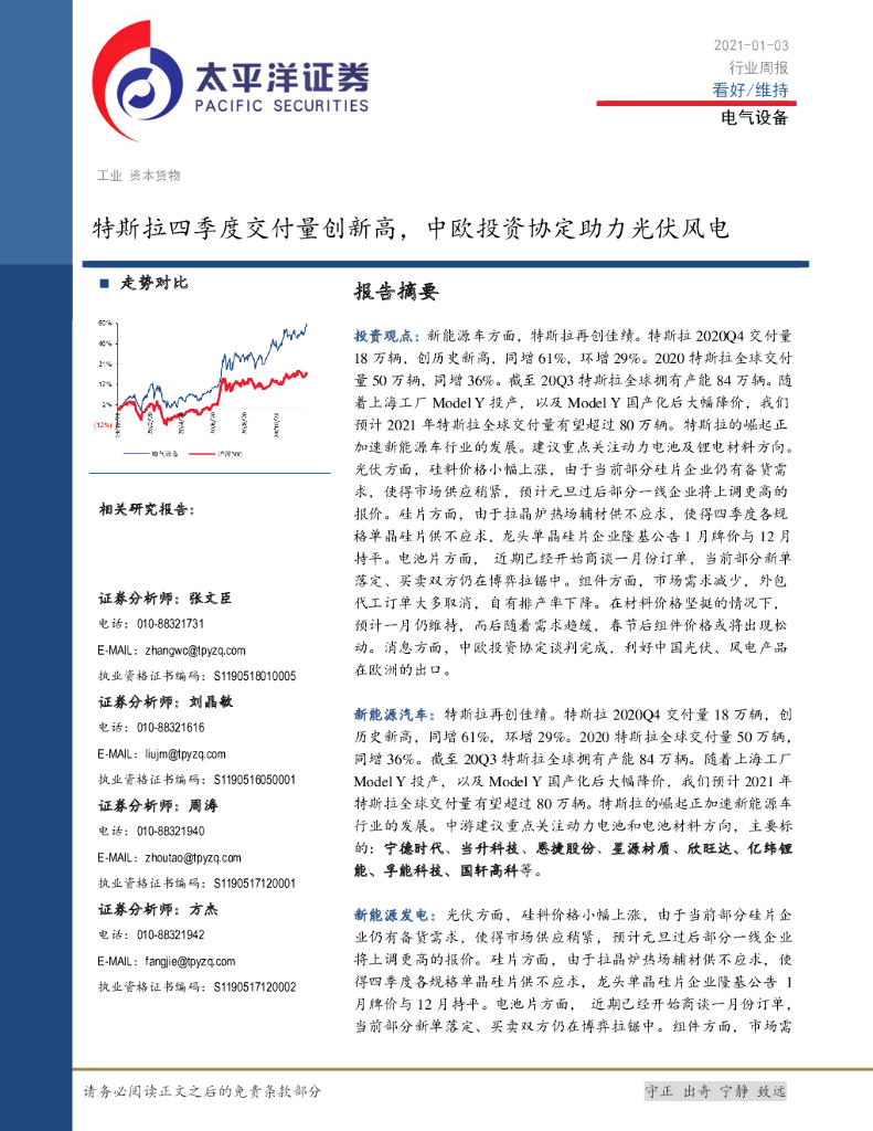 太平洋证券:电气设备行业周报:特斯拉四季度交付量创新高,中欧投资协定助力光伏风电.pdf