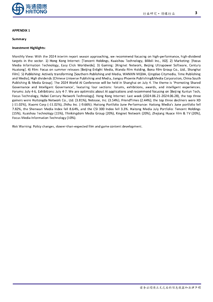 海通国际:传媒7月报:中报季业绩月关注优质白马,2024世界人工智能大会即将举行.pdf