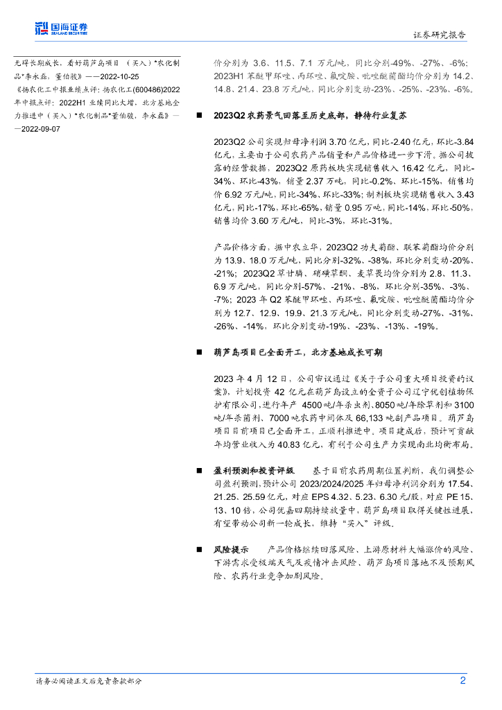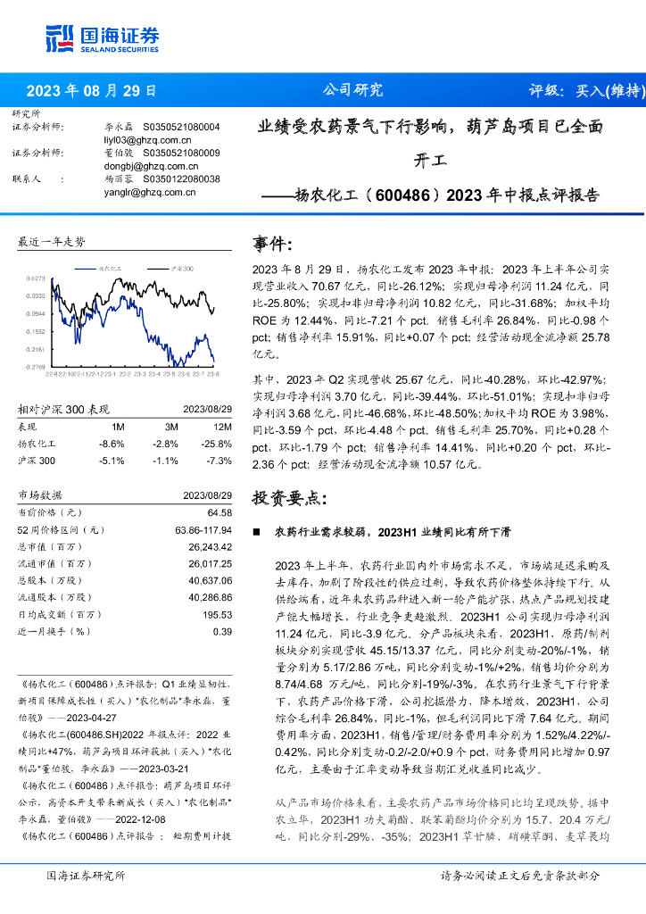 国海证券:扬农化工(600486)-2023年中报点评报告:业绩受农药景气下行影响,葫芦岛项目已全面开工.pdf