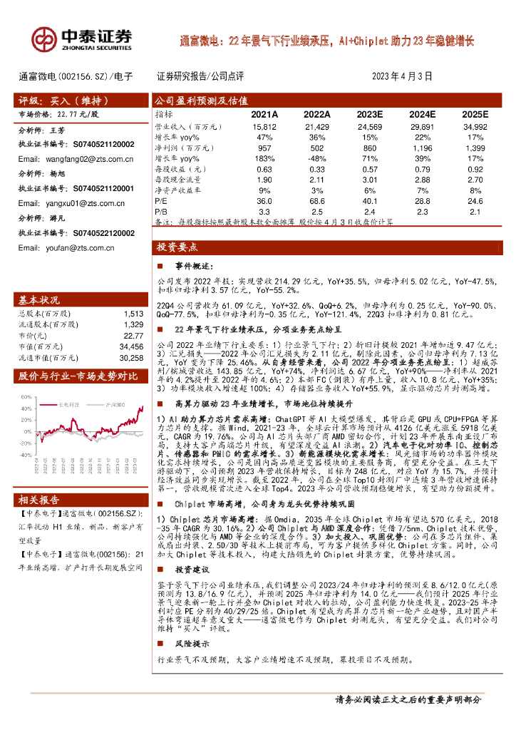 中泰证券:通富微电:22年景气下行业绩承压,AI+Chiplet助力23年稳健增长.pdf
