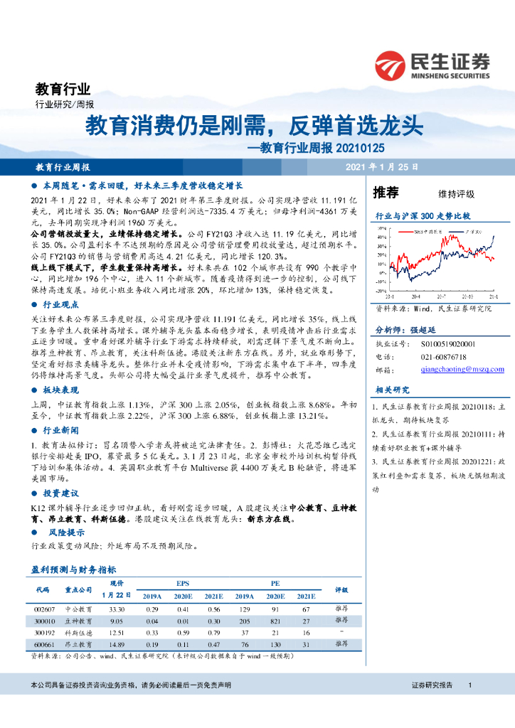 民生证券:教育行业周报:教育消费仍是刚需,反弹首选龙头.pdf