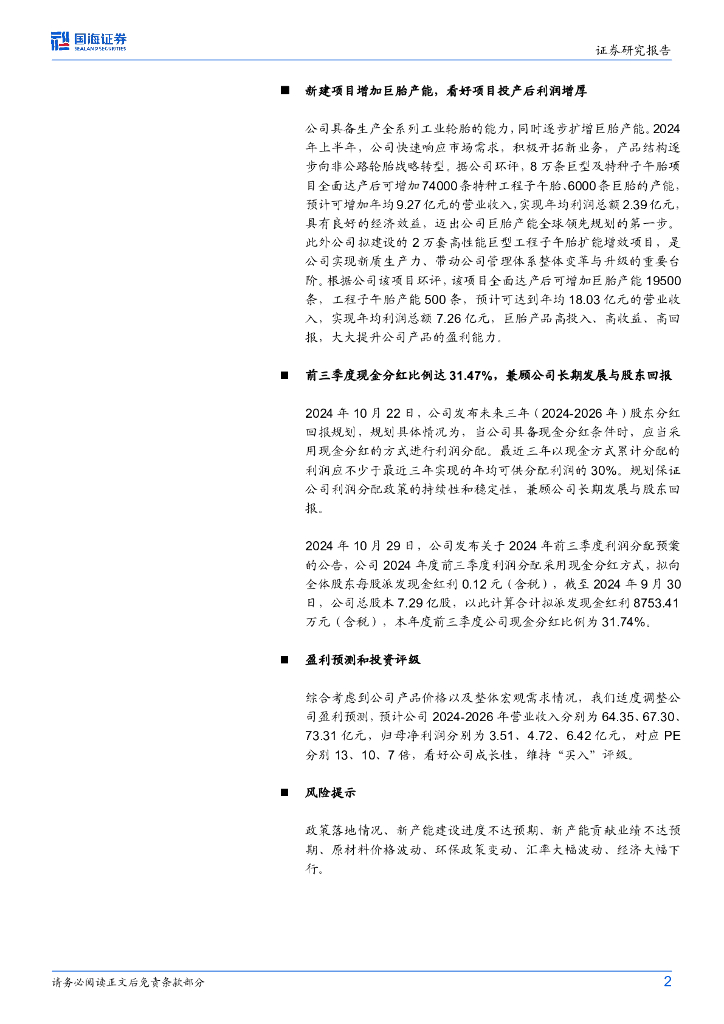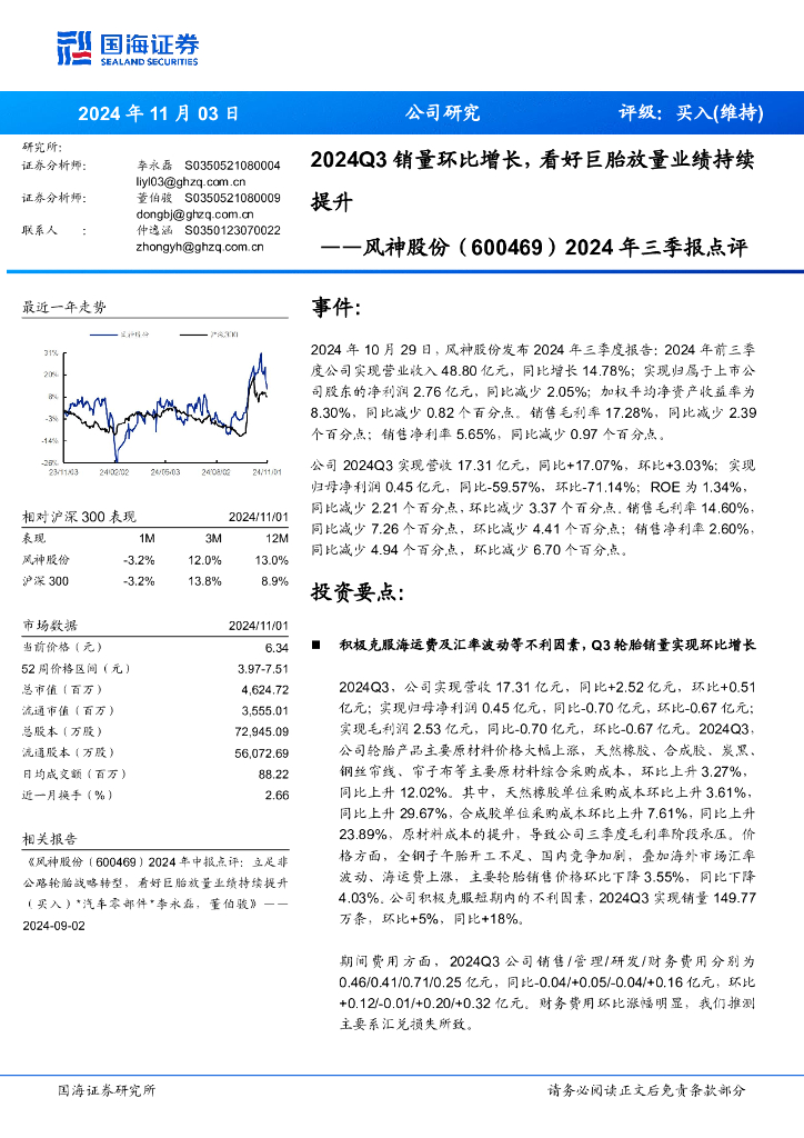 国海证券:风神股份(600469)-2024年三季报点评:2024Q3销量环比增长,看好巨胎放量业绩持续提升.pdf