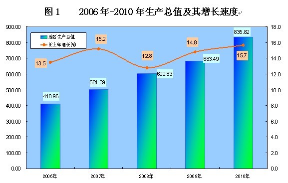 初步核算,全年生产总值(GDP)835.82亿元,按可比价格计算,比上年增长15.7%,其中,第一产业增加值171.30亿元,增长5.3%;第二产业增加值372.05亿元,增长24.1%,其中工业增加值322.79亿元,增长22.9%;第三产业增加值292.47亿元,增长12.5%。第一、二、三产业增加值占地区生产总值的比重分别为20.5%、44.5%和35.0%。三次产业对经济增长的贡献率分别为7.3%、62.3%和30.4%,其中工业的贡献率51.4%。