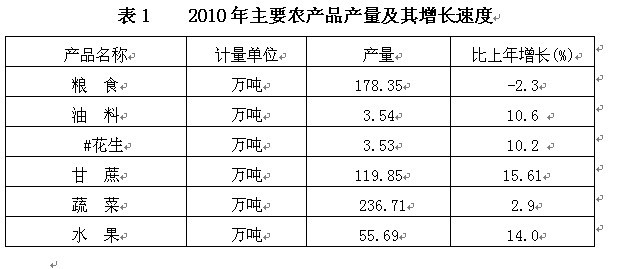 全年农作物总播种面积47.36万公顷,比上年增加0.5万公顷。其中:粮食种植面积32.32万公顷,比上年增加0.06万公顷;蔬菜种植面积9.20万公顷,比上年增加0.30万公顷;油料种植面积1.26万公顷,增加0.08万公顷;甘蔗种植面积1.35万公顷,增加0.03公顷。