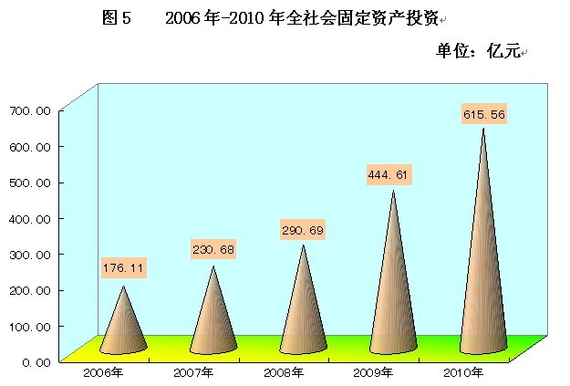 全年全社会固定资产投资615.56亿元,增长38.5%,城镇固定资产投资535.62亿元,增长40.8%,其中更新改造投资204.33亿元,增长87.3%,房地产开发投资82.72亿元,增长24.8%。商品房销售面积253.82万平米,增长46.3%。