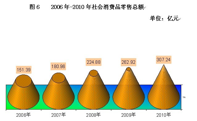 全年全市社会消费品零售总额307.24亿元,增长19.0%。其中,批发业零售额31.28亿元,增长23.5%,零售业零售额248.48亿元,增长18.1%,住宿业零售额2.17亿元,增长29.8%,餐饮业零售额25.31亿元,增长21.0%。城镇市场实现消费品零售额280.16亿元,增长19.0%,其中城区消费品市场实现零售额149.12亿元,增长20.1%;乡村消费品市场实现零售额27.09亿元,增长18.7%。