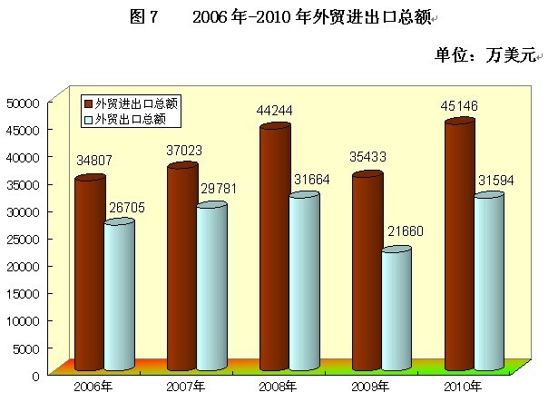 全年全市外贸进出口总额45146万美元,增长27.4%,其中出口31594万美元,增长45.9%,进口13553万美元,下降1.6%。实际利用外资4985万美元(商务部口径),增长3.1%。