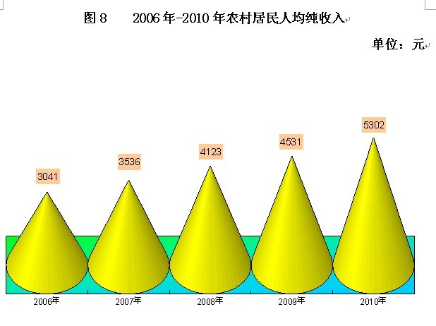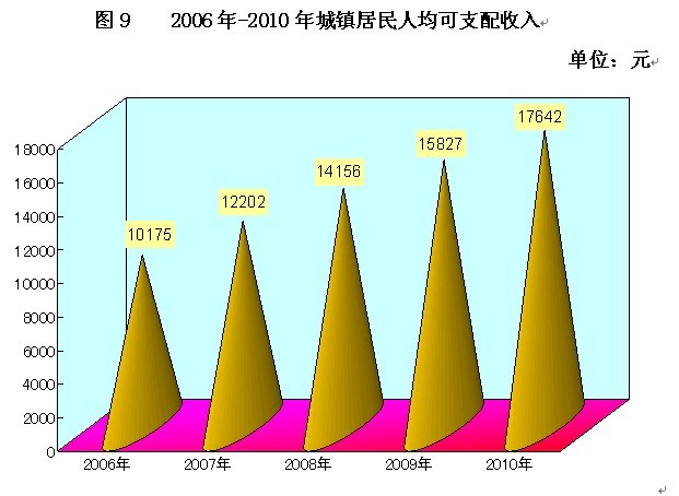 城乡居民收入继续增加,人民生活水平稳步提高。全年农村居民人均纯收入5302元,比上年增长17.0%;城镇居民人均可支配收入17642元,比上年增长11.5%。