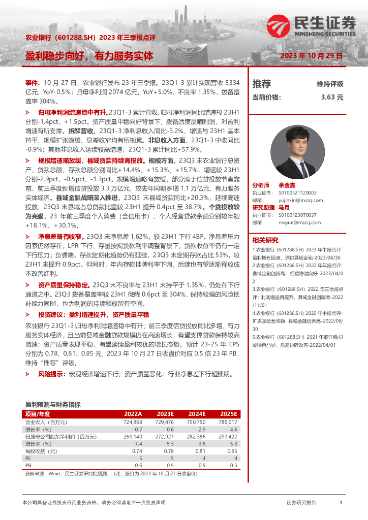 民生证券:农业银行(601288)-2023年三季报点评:盈利稳步向好,有力服务实体.pdf