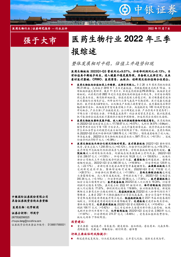 中银证券:医药生物行业2022年三季报综述:整体发展相对平稳,估值上升趋势初现.pdf