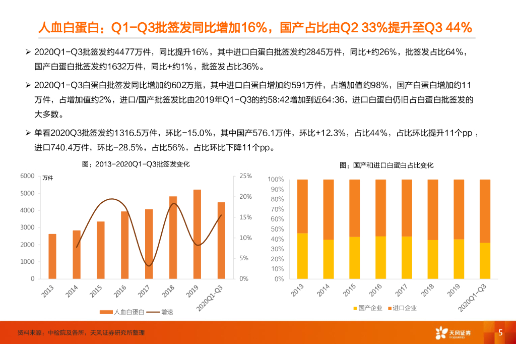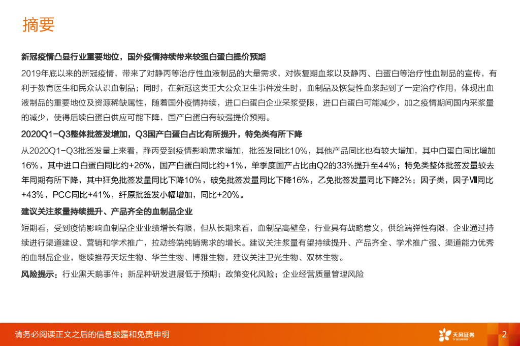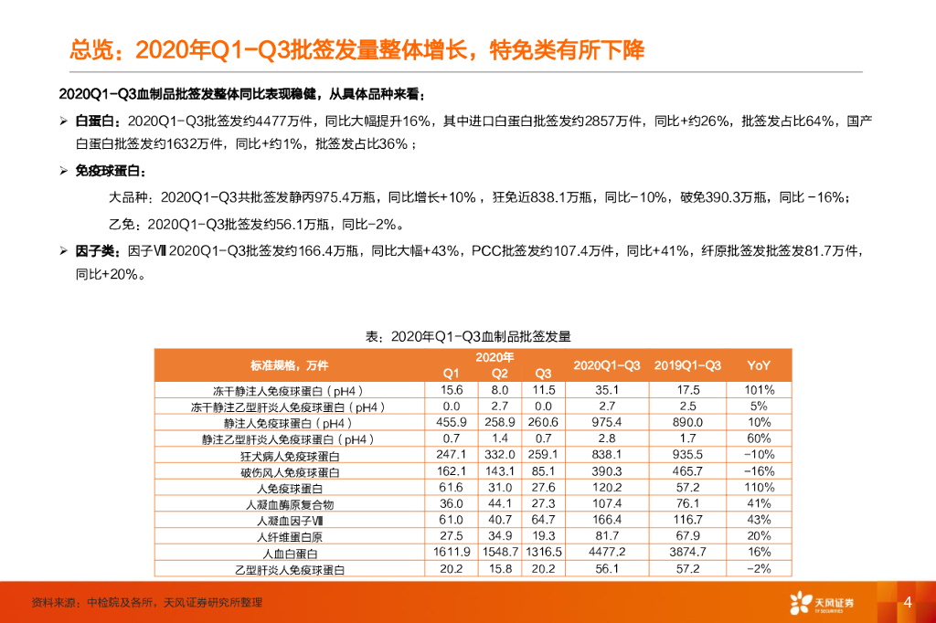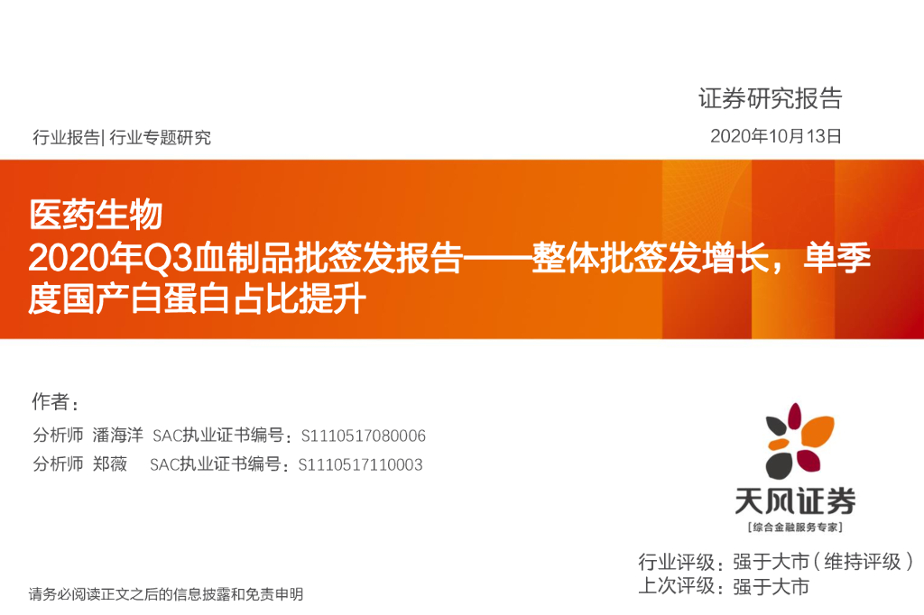 天风证券:医药生物行业专题研究:2020年Q3血制品批签发报告——整体批签发增长,单季度国产白蛋白占比提升.pdf