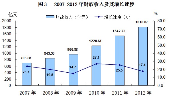 全年财政收入1810.07亿元,比上年增长17.4%。公共财政预算收入1165.98亿元,增长23.0%,其中,税收收入762.46亿元,增长18.2%。公共财政预算支出2965.20亿元,增长16.5%。