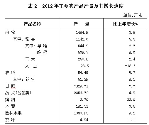 全年粮食产量1484.9万吨,比上年增长3.8%;油料产量54.49万吨,增长8.7%;甘蔗产量7829.71万吨,增长7.7%;蔬菜产量(含食用菌)2356.72万吨,增长4.9%;园林水果产量1030.95万吨,增长9.2%。