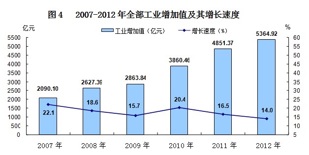 全年全部工业增加值5364.92亿元,比上年增长14.0%。规模以上工业增加值增长15.9%。在规模以上工业中,国有企业增长16.7%,集体企业增长16.0%,股份制企业增长15.1%,外商及港澳台商投资企业增长13.3%,其他经济类型企业增长26.9%。轻工业增长17.2%,重工业增长15.4%。