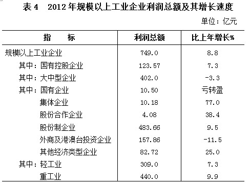 全年规模以上工业经济效益综合指数307.5,比上年提高2.6点;主营业务收入14324.38亿元,增长17.4%;利税总额1462.26亿元,增长16.4%,其中利润总额749.0亿元,增长8.8%。
