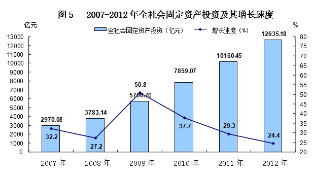 全年全社会固定资产投资[3]12635.18亿元,比上年增长24.4%,扣除价格因素,实际增长20.4%。其中,固定资产投资12171.78亿元(其中,计划总投资500万元及以上项目投资9345.18亿元),比上年增长24.8%;农户投资463.4亿元,增长13.1%。