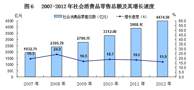 全年社会消费品零售总额4474.59亿元,比上年增长15.9%,扣除价格因素,实际增长13.3%。按经营地统计,城镇消费品零售额3947.43亿元,增长15.8%;乡村消费品零售额527.15亿元,增长16.4%。