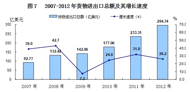 全年货物进出口总额294.74亿美元,比上年增长26.2%。其中,货物出口154.68亿美元,比上年增长24.2%;货物进口140.05亿美元,增长28.5%。进出口差额(出口减进口)14.63亿美元。从出口企业性质看,国有企业出口23.97亿美元,比上年增长22.4%;外商投资企业出口35.42亿美元,增长33.8%;私营企业出口93.92亿美元,增长22.4%。