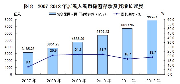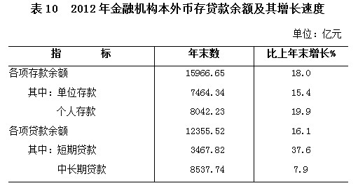 年末金融机构本外币各项存款余额15966.65亿元,比年初增加2439.03亿元,其中人民币各项存款余额15856.0亿元,增加2403.15亿元。年末金融机构本外币各项贷款余额12355.52亿元,比年初增加1708.37亿元,其中人民币各项贷款余额11941.44亿元,增加1532.17亿元。