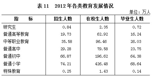 全年研究生教育招生0.84万人,在校研究生2.35万人,毕业生0.72万人。普通高等教育招生19.73万人,在校生62.92万人,毕业生16.24万人。各类中等职业教育(含技工)招生35.58万人,在校生96.46万人,毕业生26.03万人。普通高中招生29.28万人,在校生79.58万人,毕业生23.75万人。普通初中招生66.87万人,在校生196.62万人,毕业生64.38万人。普通小学招生74.21万人,在校生426.48万人,毕业生68.64万人。特殊教育招生0.25万人,在校生1.43万人,毕业生0.14万人。幼儿园在园幼儿165.93万人。