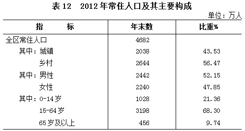 年末全区总人口5240万人,比上年末增加41万人。年末常住人口[5]4682万人,比上年末增加37万人,其中城镇人口2038万人。全年出生人口74万人,出生率14.20‰;死亡人口33万人,死亡率6.31‰;自然增长率7.89‰。