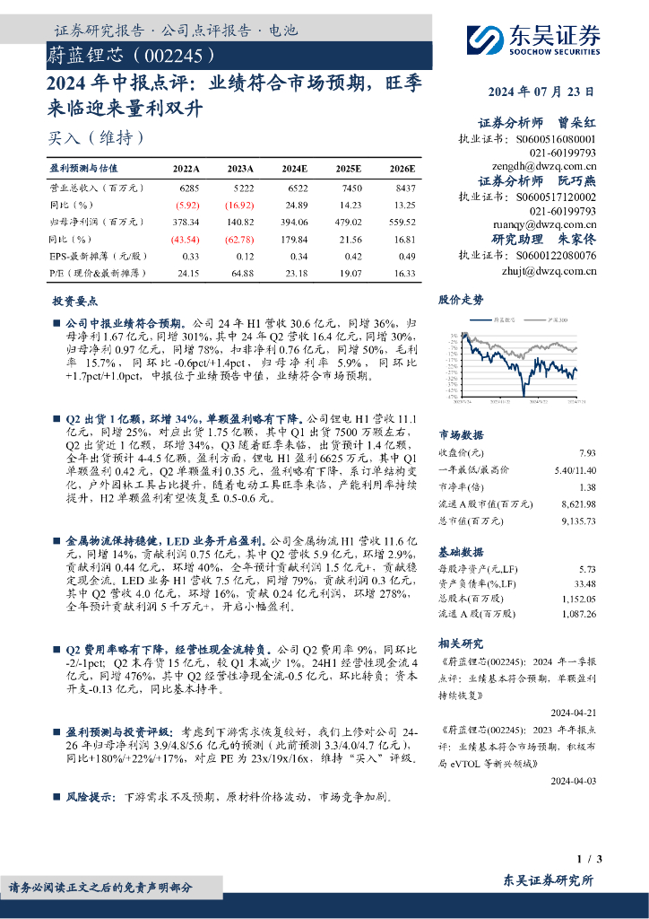 东吴证券:蔚蓝锂芯(002245)-2024年中报点评:业绩符合市场预期,旺季来临迎来量利双升.pdf