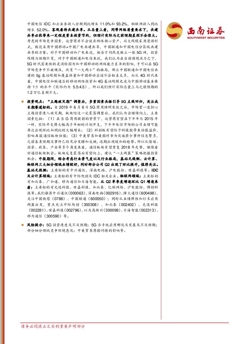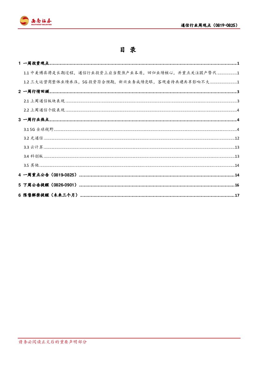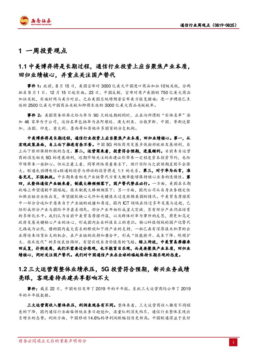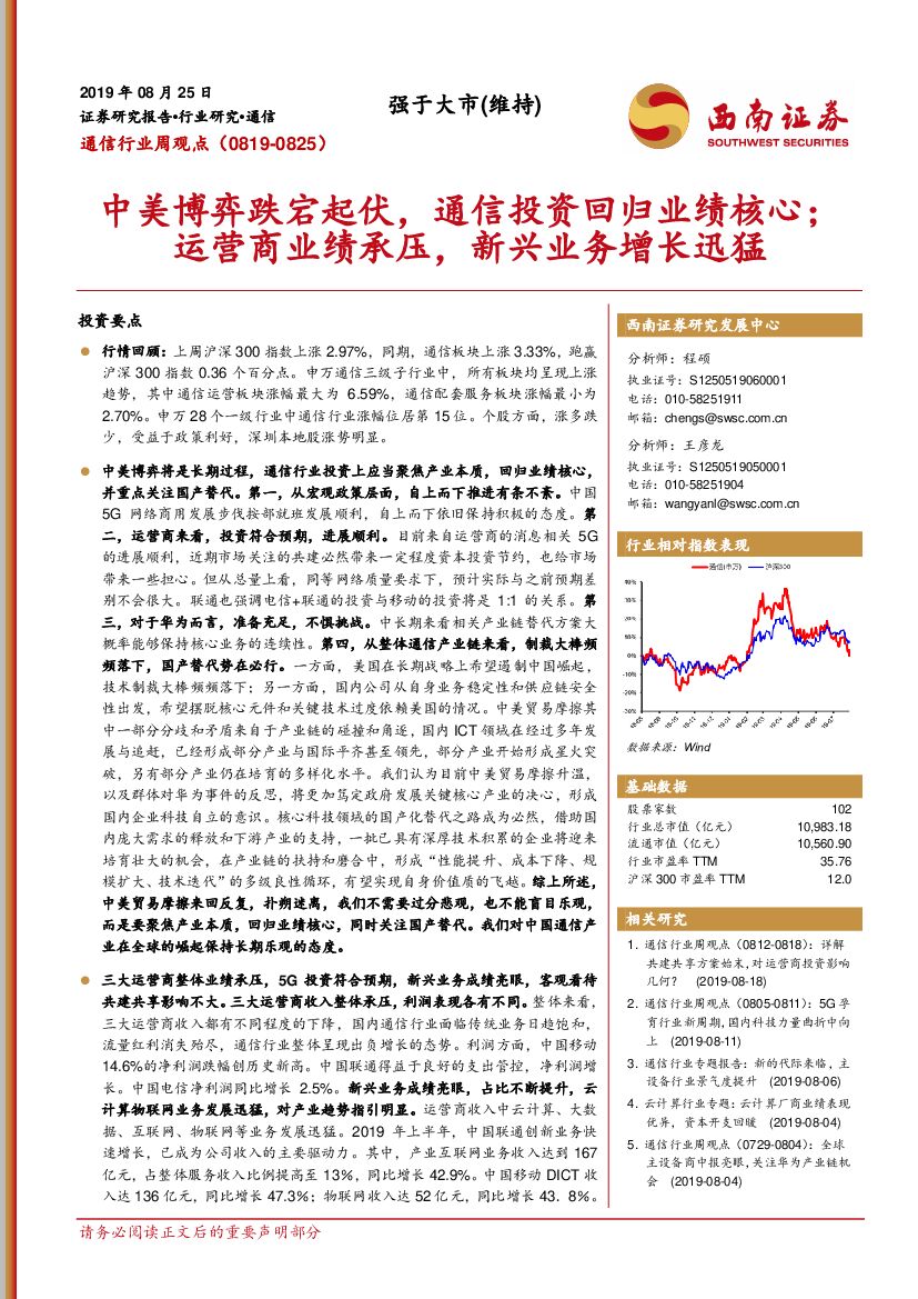 西南证券:通信行业周观点:中美博弈跌宕起伏,通信投资回归业绩核心;运营商业绩承压,新兴业务增长迅猛.pdf