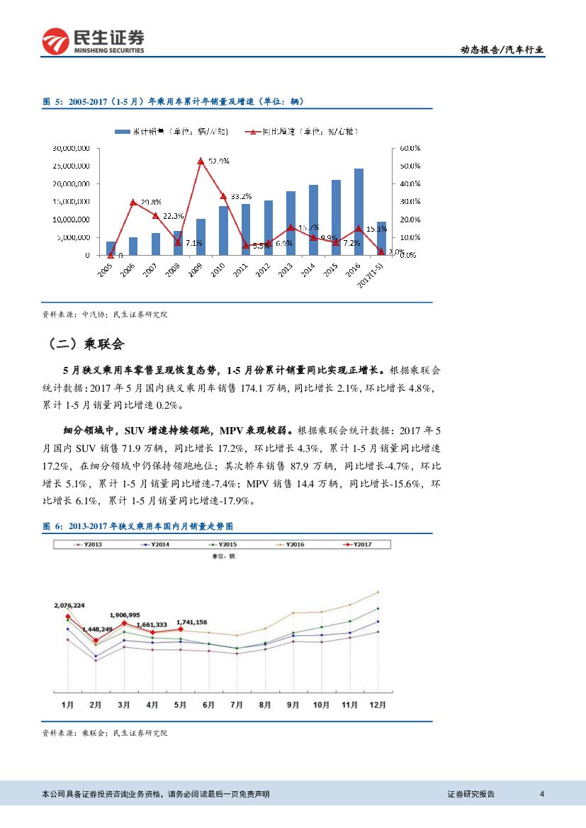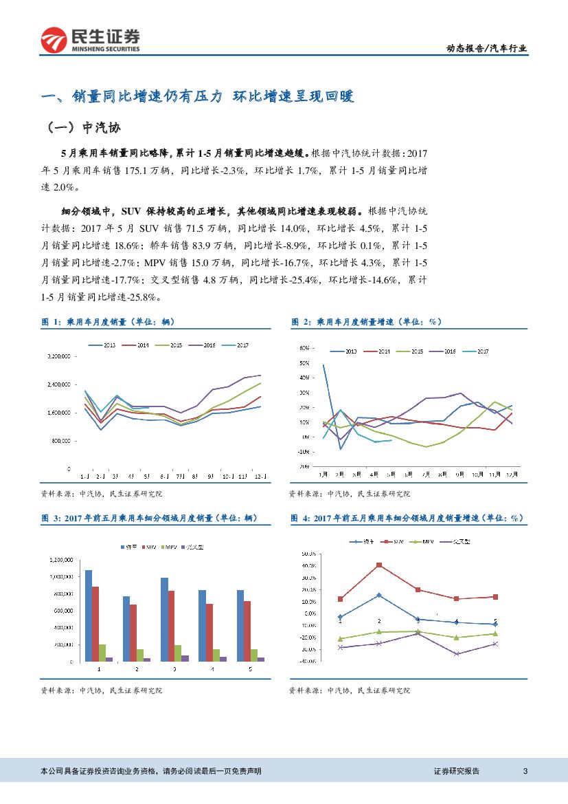 民生证券:汽车数据监控系列之2017年5月乘用车:销量同比增速仍有压力 环比增速呈现回暖.pdf