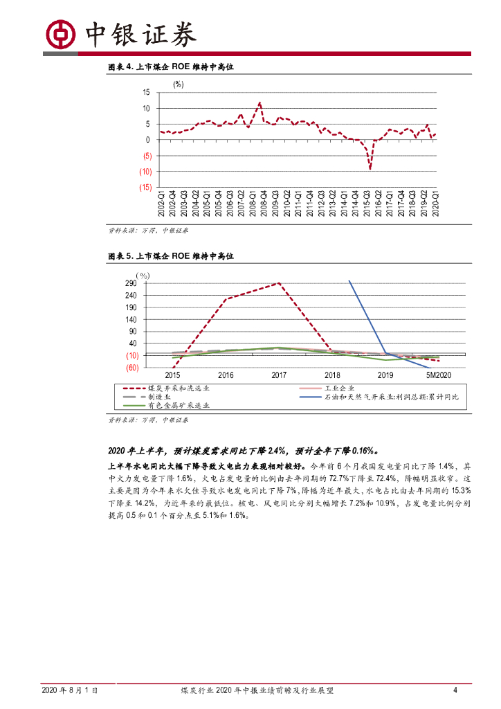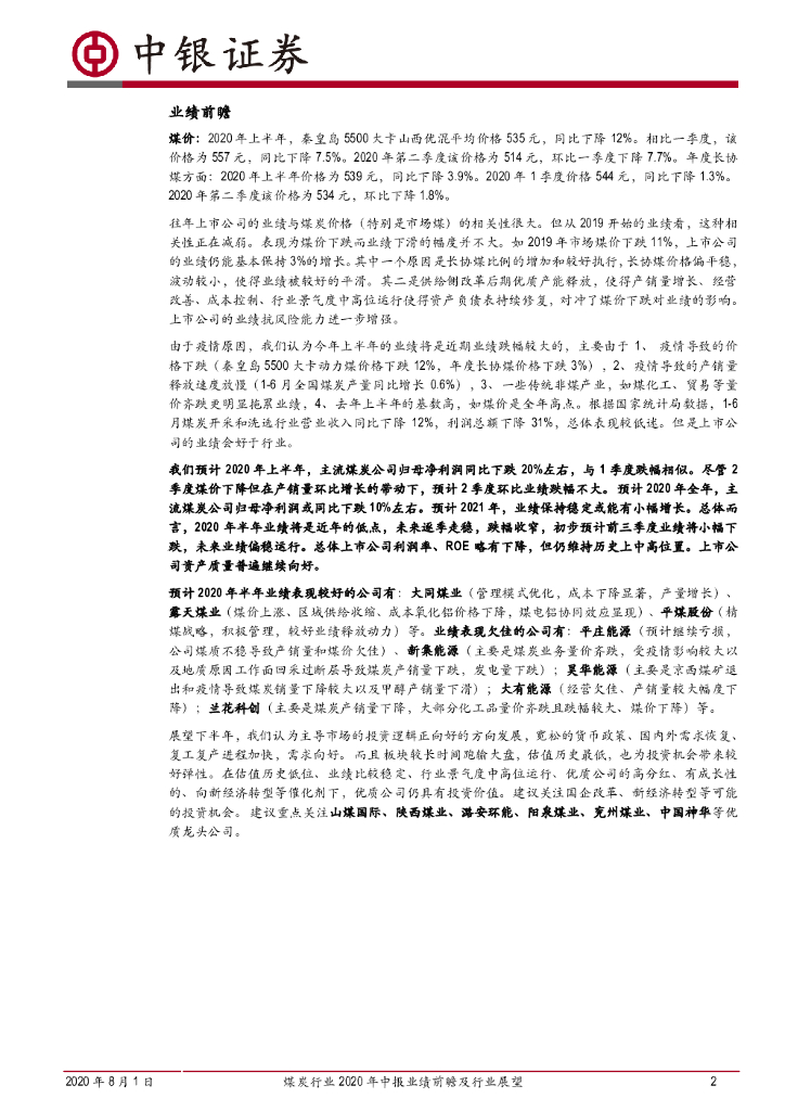 中银证券:煤炭行业2020年中报业绩前瞻及行业展望:预计中报业绩下跌20%,全年下降10%.pdf