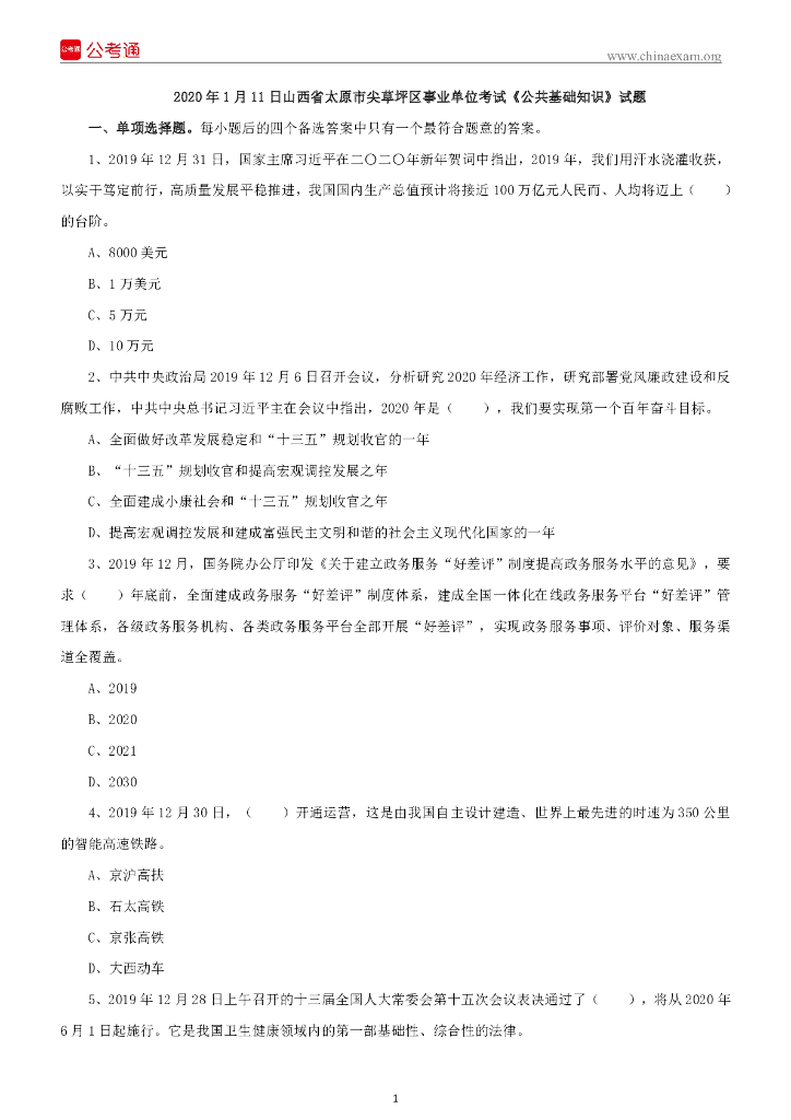 2020年1月11日山西省太原市尖草坪区事业单位考试《公共基础知识》试题.pdf