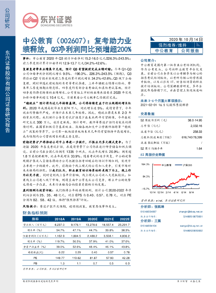 东兴证券:中公教育(002607)-复考助力业绩释放,Q3净利润同比预增超200%.pdf