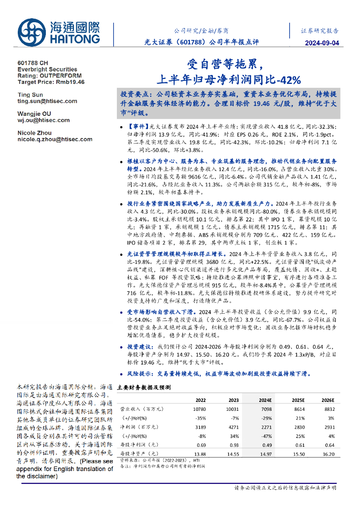 海通国际:光大证券(601788)-公司半年报点评:受自营等拖累,上半年归母净利润同比-42%.pdf