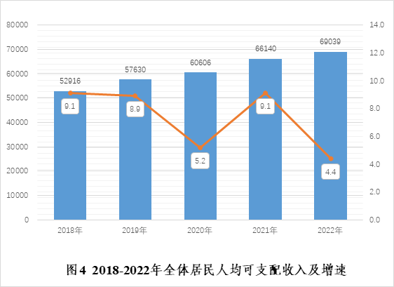 居民收支平稳增长。全年全体居民人均可支配收入69039元,比上年增长4.4%。其中,工资性收入43105元,增长4.1 %;经营净收入7212元,增长3.7%;财产净收入7063元,增长2.9%;转移净收入11659元,增长6.9%。按照常住地分,城镇居民人均可支配收入76643元,增长4.1%;农村居民人均可支配收入34664元,增长6.0%。全年全体居民人均消费支出40313元,比上年增长3.1%。按常住地分,城镇居民人均消费支出43629元,增长2.7%;农村居民人均消费支出25322元,增长5.5%。全体居民恩格尔系数为26.0%,其中城镇为25.5%,农村为29.8%。