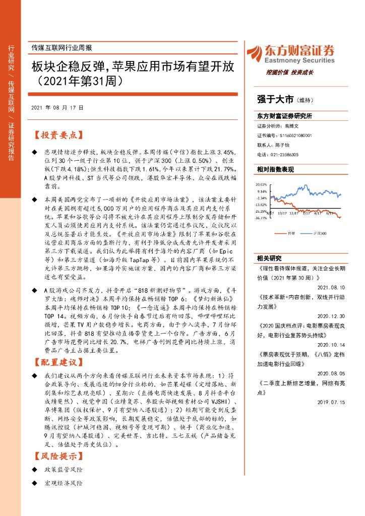 东方财富证券:传媒互联网行业周报:板块企稳反弹,苹果应用市场有望开放(2021年第31周).pdf