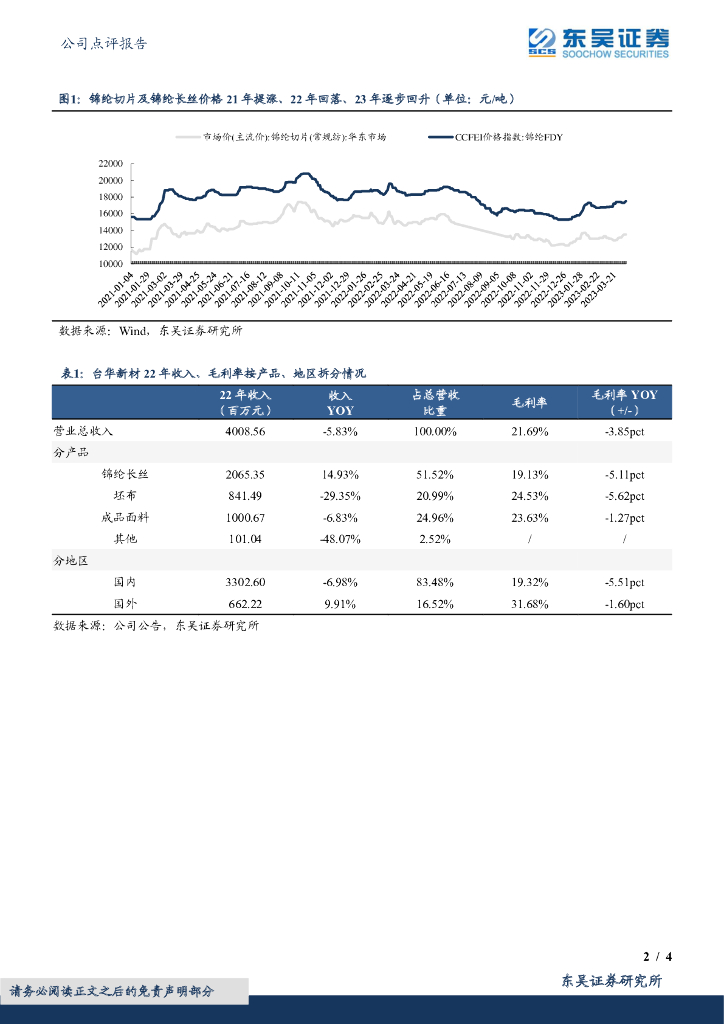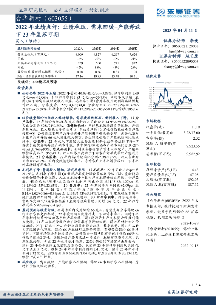 东吴证券:台华新材(603055)-2022年业绩点评:业绩承压,需求回暖+产能释放下23年复苏可期.pdf