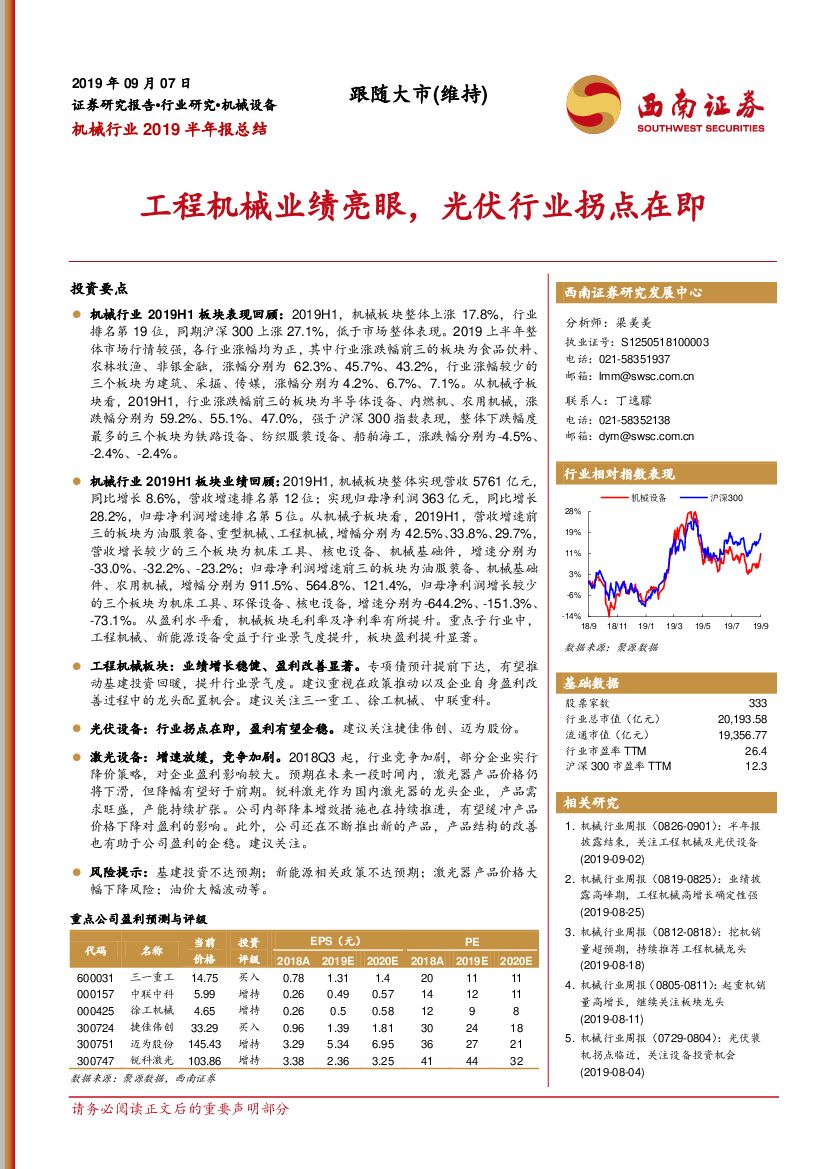 西南证券:机械行业2019半年报总结:工程机械业绩亮眼,光伏行业拐点在即.pdf