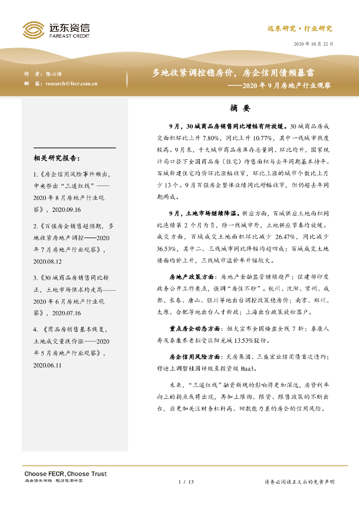 远东资信:多地收紧调控稳房价,房企信用债频暴雷——2020年9月房地产行业观察报告.pdf