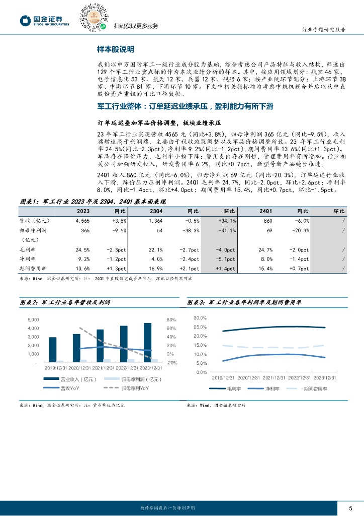 国金证券:军工行业23年年报及24年一季报业绩综述:业绩阶段性承压,静候需求回暖.pdf