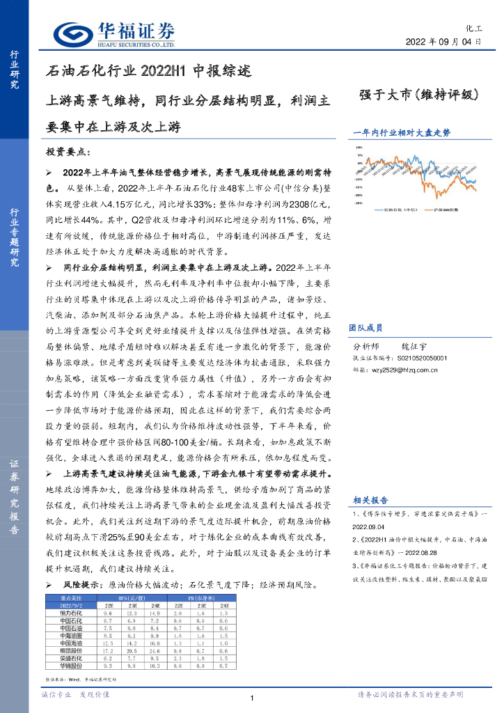 华福证券:石油石化行业2022H1中报综述:上游高景气维持,同行业分层结构明显,利润主要集中在上游及次上游.pdf