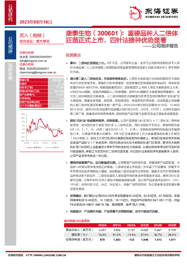 东海证券:康泰生物(300601)-公司简评报告:重磅品种人二倍体狂苗正式上市,四针法接种优势显著.pdf