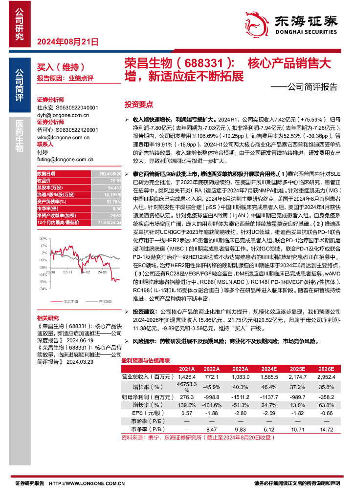 东海证券:荣昌生物(688331)-公司简评报告:核心产品销售大增,新适应症不断拓展.pdf