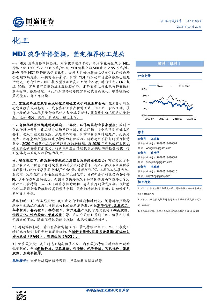 国盛证券:化工行业周报:MDI淡季价格坚挺,坚定推荐化工龙头.pdf