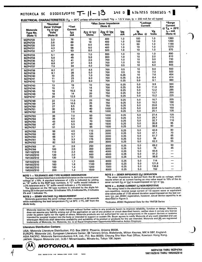 MOTOROLA MZP4728 thru MZP4764 1M110ZS10 thru 1M200ZS10 数据手册.pdf