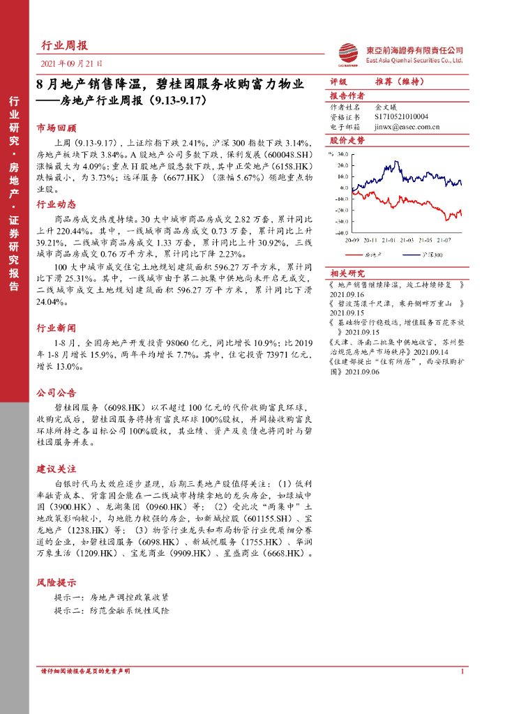 东亚前海证券:房地产行业周报:8月地产销售降温,碧桂园服务收购富力物业.pdf