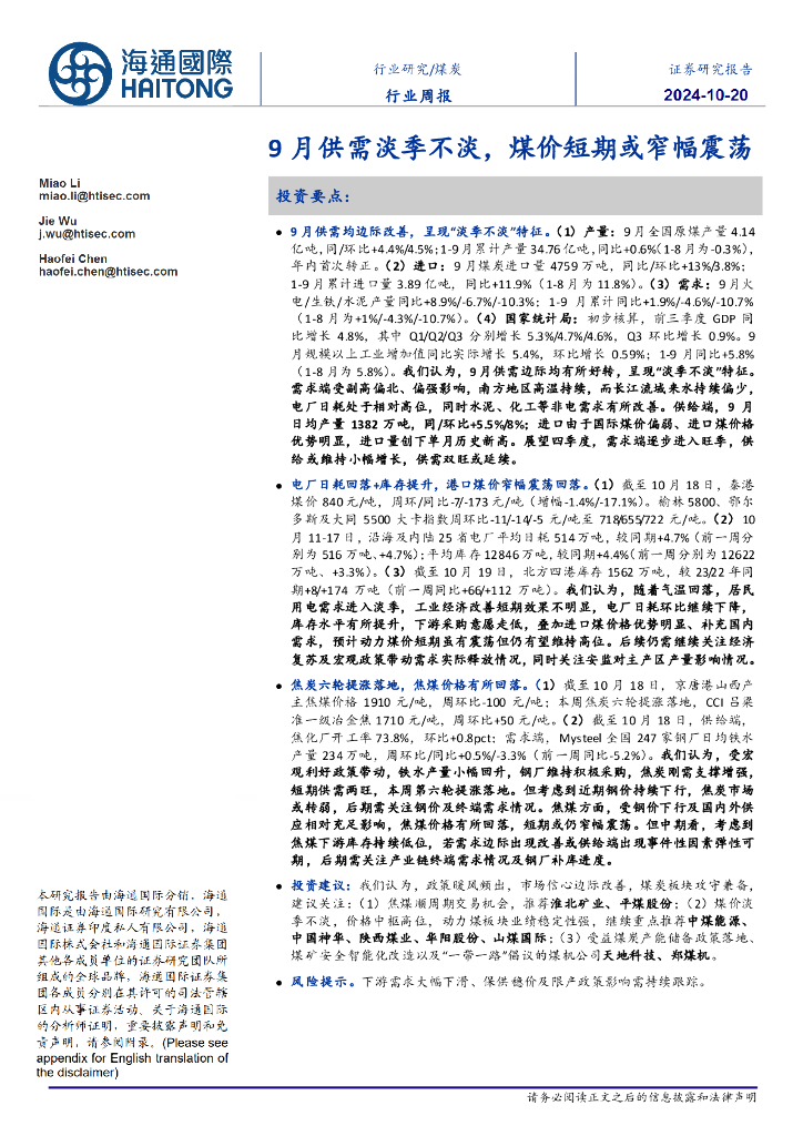 海通国际:煤炭行业周报:9月供需淡季不淡,煤价短期或窄幅震荡.pdf