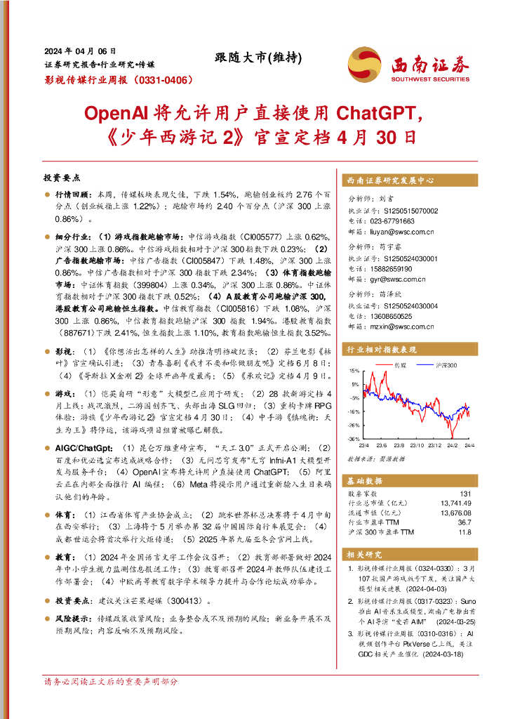 西南证券:影视传媒行业周报:OpenAI将允许用户直接使用ChatGPT,《少年西游记2》官宣定档4月30日.pdf