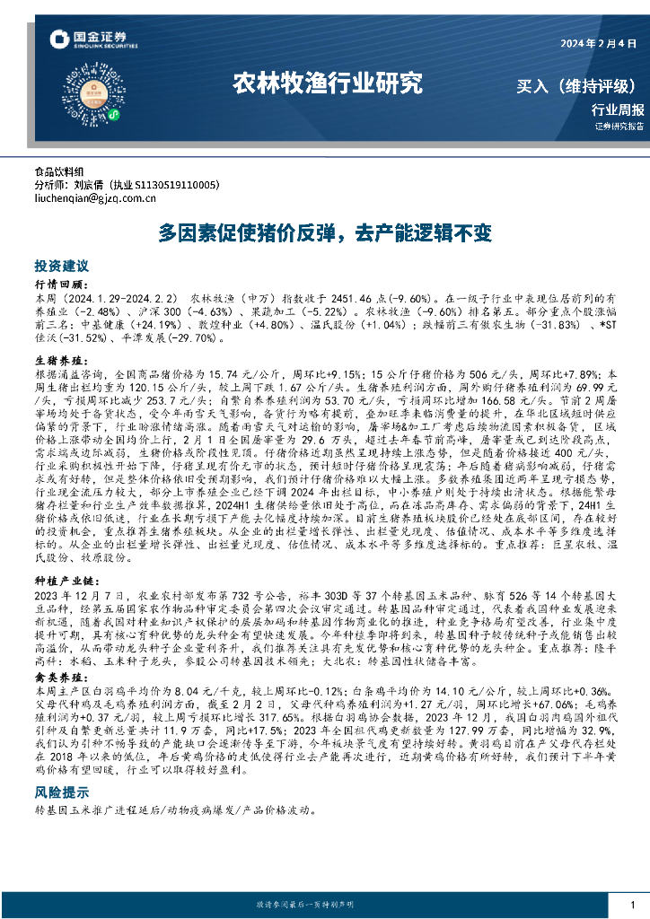 国金证券:农林牧渔行业研究周报:多因素促使猪价反弹,去产能逻辑不变.pdf