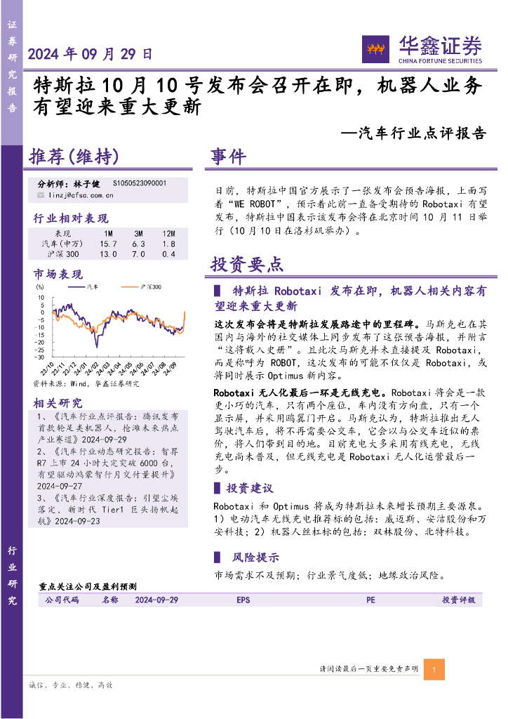 华鑫证券:汽车行业点评报告:特斯拉10月10号发布会召开在即,机器人业务有望迎来重大更新.pdf